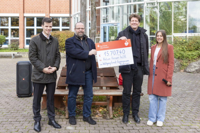 „Schülerinnen und Schüler können etwas bewirken, wenn sie Verantwortung übernehmen und sich engagieren“, sagte der Bundestagsabgeordnete Johannes Wiegelmann (CDU) bei der Spendenübergabe am Wolfgang-Ernst-Gymnasium (WEG) in Büdingen. Bei einer kurzen Zusammenkunft auf dem Schulhof würdigte er gemeinsam mit dem Schulleiter Oliver Eissing, mit Tobias Greilich, dem Vorsitzenden des Vereins Aktion Hessen hilft e.V., und Nicole Seip, der Organisatorin, den Einsatz der Schülerinnen und Schüler beim diesjährigen Sponsorenlauf des Gymnasiums.