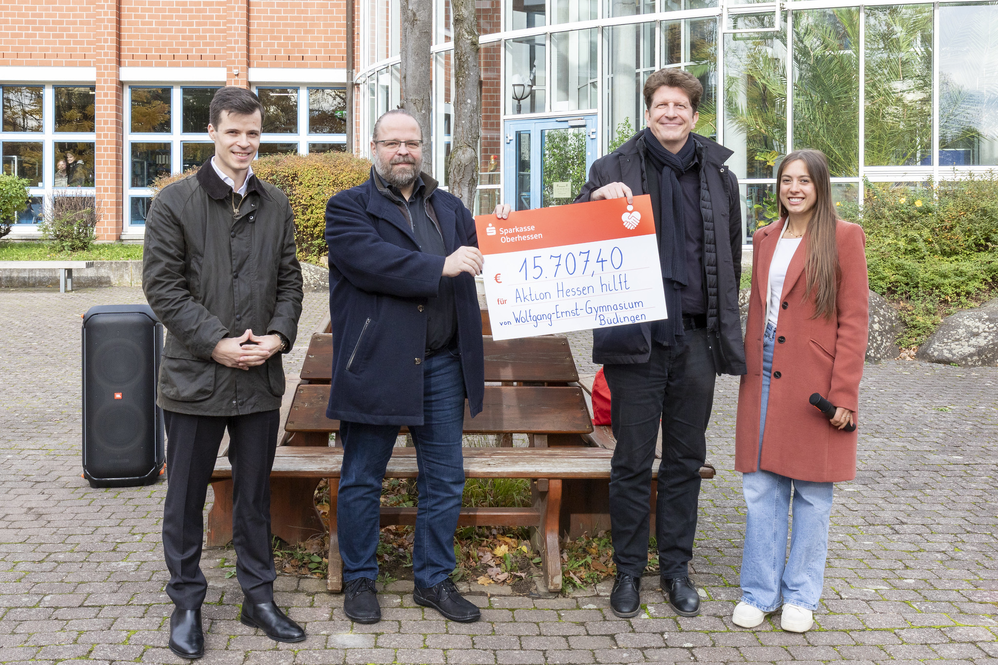 Foto (2): Johannes Wiegelmann (Bundestagsabgeordneter der CDU), Tobias Greilich (Aktion Hessen hilft), Oliver Eissing (Schulleiter), Nicole Seip (Lehrerin und Organisatorin)
