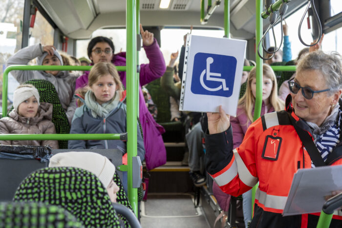 Der Bus und die Haltestelle wurden gründlich erkundet: Markierungen auf dem Bordstein, Plätze für Rollstühle oder Kinderwagen, die Rampe, Haltestellenknöpfe und die vielen Stangen und Griffe zum Festhalten während der Fahrt. Besonders eindrucksvoll war die Bremsprobe im Industriegebiet. Bei Schrittgeschwindigkeit brachte Tobias mit einer kräftigen Bremsung den ganzen Bus ins Ruckeln. „Das war voll stark!“, fand Emma und war gleichzeitig überrascht, wie viel Kraft schon hinter einer langsamen Bremsung steckt.