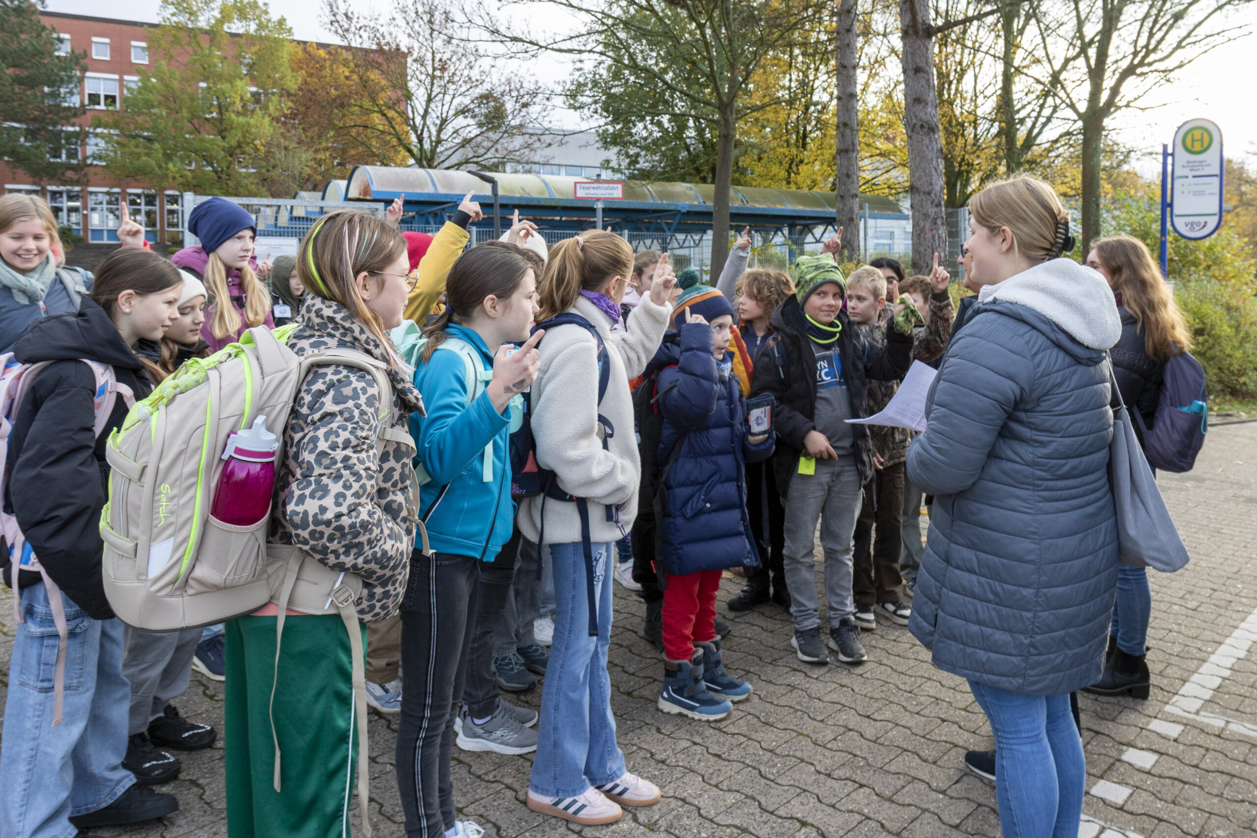 Gerade morgens oder nach der sechsten Stunde herrscht hier dichtes Gedränge: Busse, Elterntaxis, nasses Novemberwetter und viele Schülerinnen und Schüler aus zwei Schulen sorgen für allerhand Trubel. Umso wichtiger ist es, die Perspektive der anderen Verkehrsteilnehmer kennenzulernen und besonders die der Busfahrer. Trainerin Birgit Gralla von der VGO und Busfahrer Tobias führten die Kinder deshalb behutsam und auf Augenhöhe an alle Situationen heran.