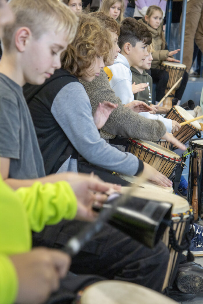 Zu Beginn standen praktische Erfahrungen auf dem Plan: Wie hält man eine Djembe richtig? Wo entstehen „Bass“ und „Slam“? Und warum klingt jede Trommel ein wenig anders? Doch bald ging es um mehr als nur Technik. Mit Regenmachern, Holzfröschen und kleinen Percussion-Instrumenten ließen die Kinder gemeinsam Naturgeräusche entstehen: Blitz, Donner und Regen tauchten den Unterrichtsraum in eine kleine Klanglandschaft.