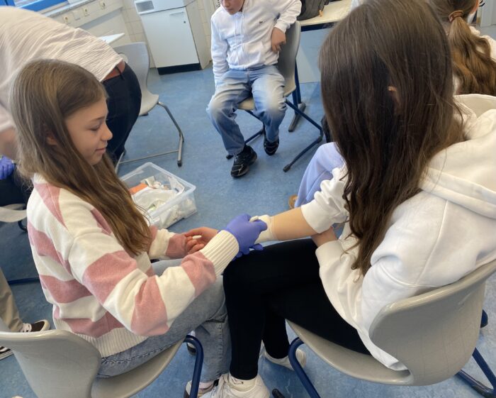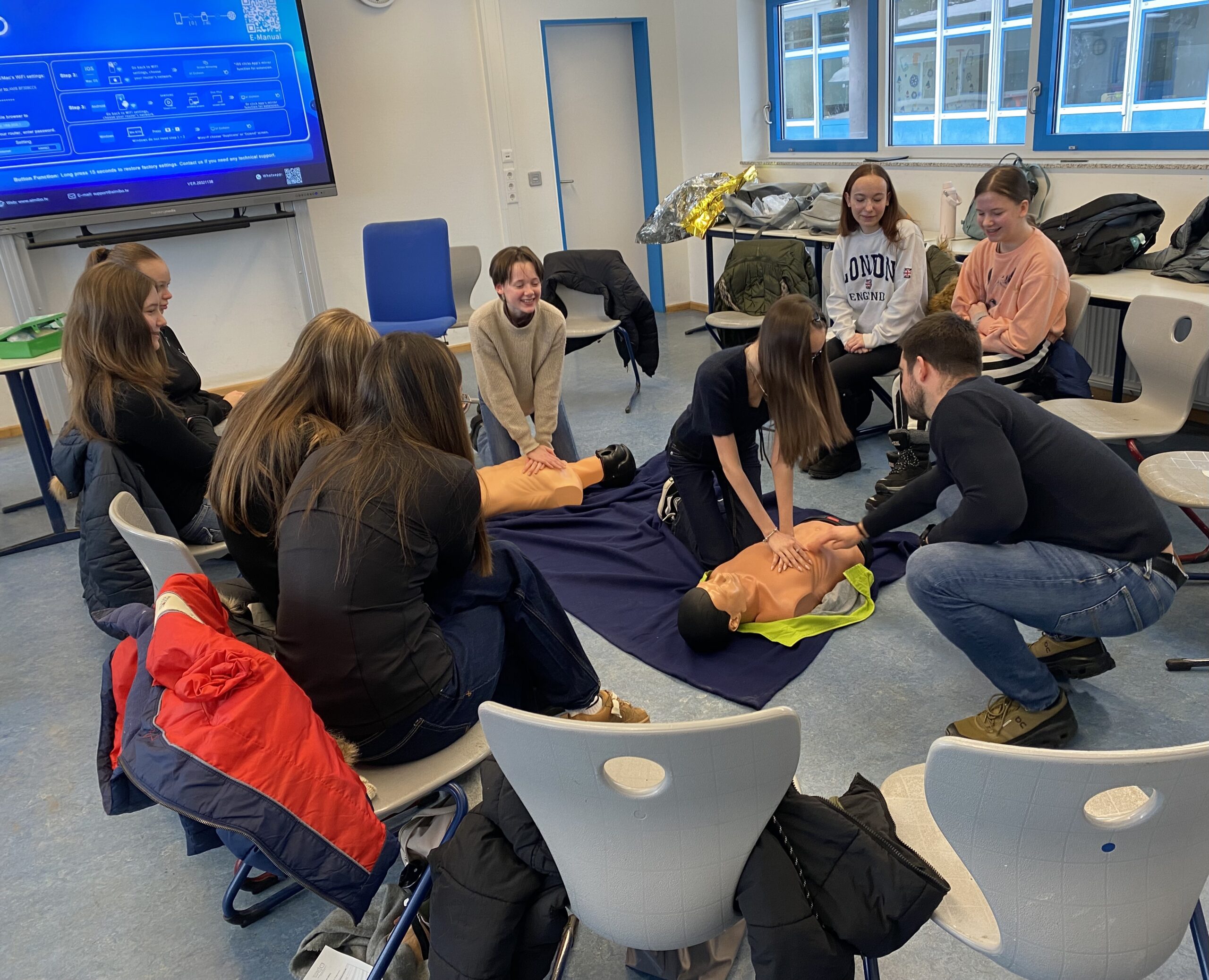 In einem Erste-Hilfe-Kurs lernten die Schülerinnen und Schüler, wie sie in unerwarteten Situationen helfen können – etwa bei einem Unfall oder einem plötzlichen Zusammenbruch. Dabei wurde deutlich, wie wertvoll es ist, schon früh Sicherheit im Umgang mit solchen Situationen zu gewinnen und Verantwortung für andere zu übernehmen.